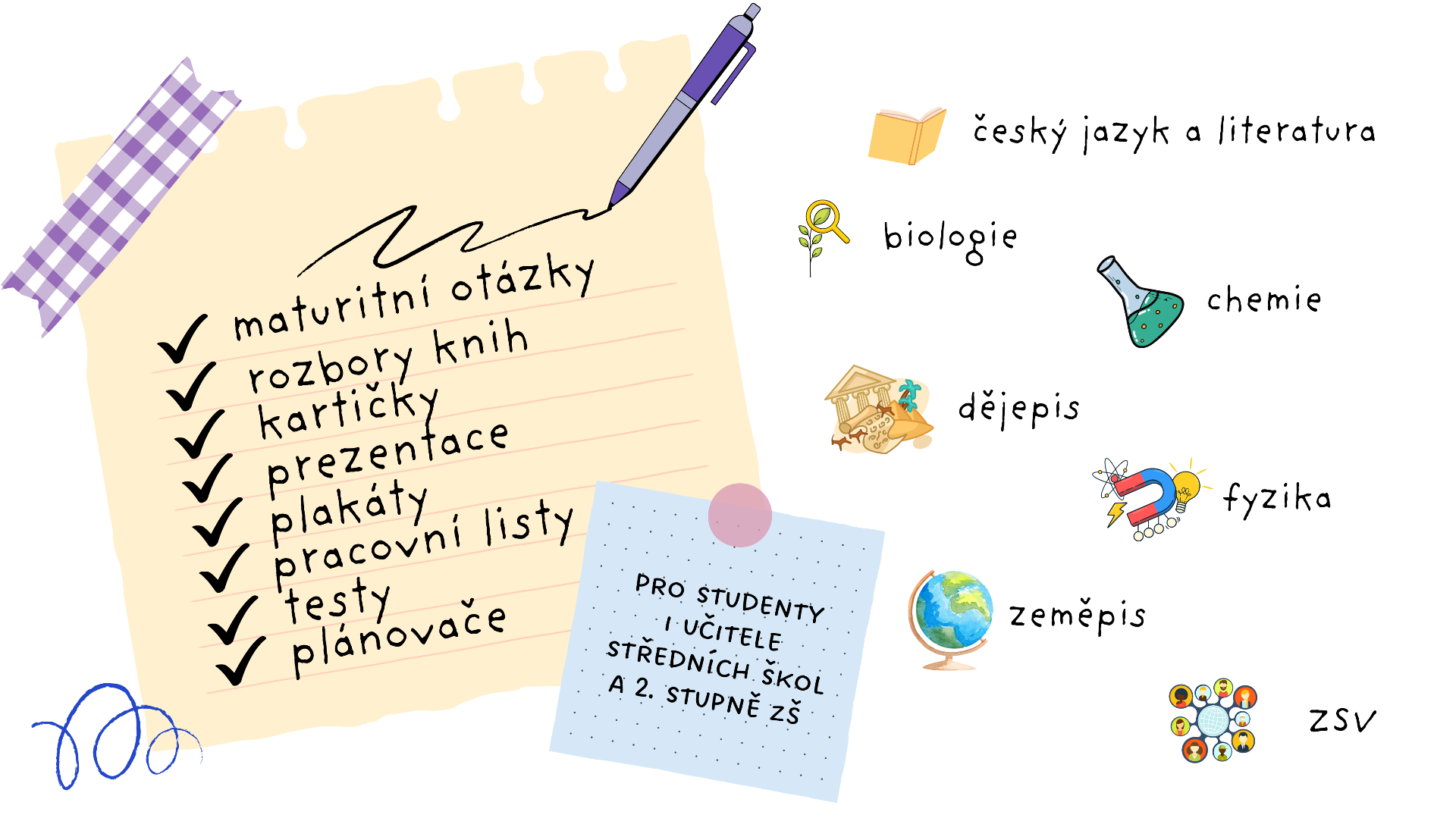Desítky výukových materiálů z oblasti českého jazyka, biologie, chemie, fyziky, zeměpisu, základů společenských věd, dějepisu a dalších. Databáze se neustále rozšiřuje.