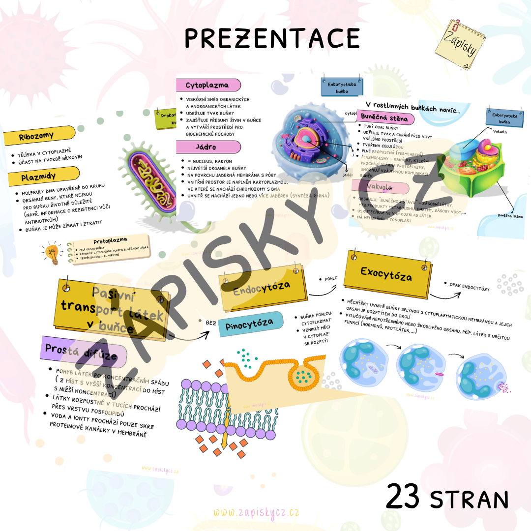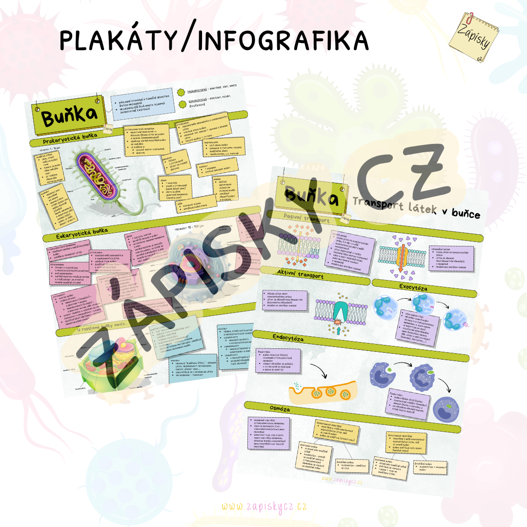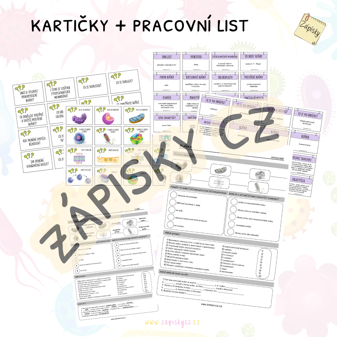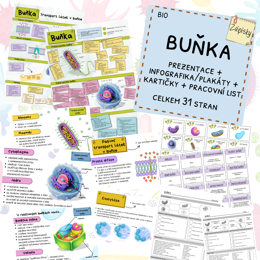 Shrnutí tématu buňka a transportu látek v buňce. Materiál obsahuje prezentaci, infografiku/plakáty, kartičky k procvičování a pracovní list - celkem 31 stran.