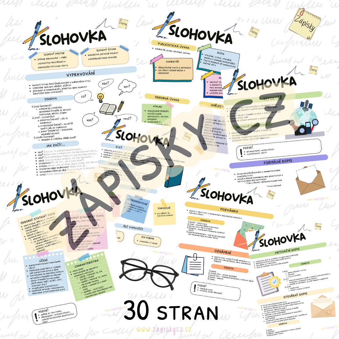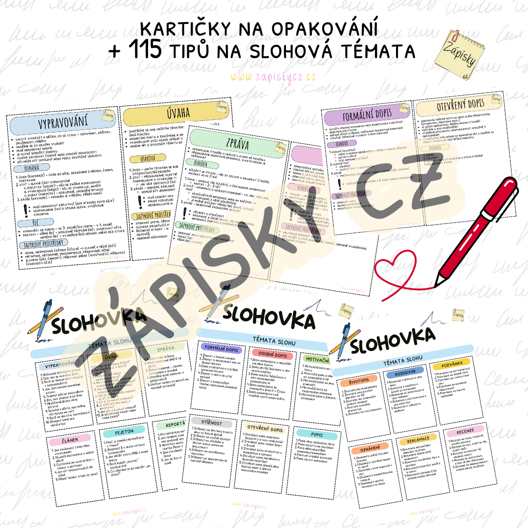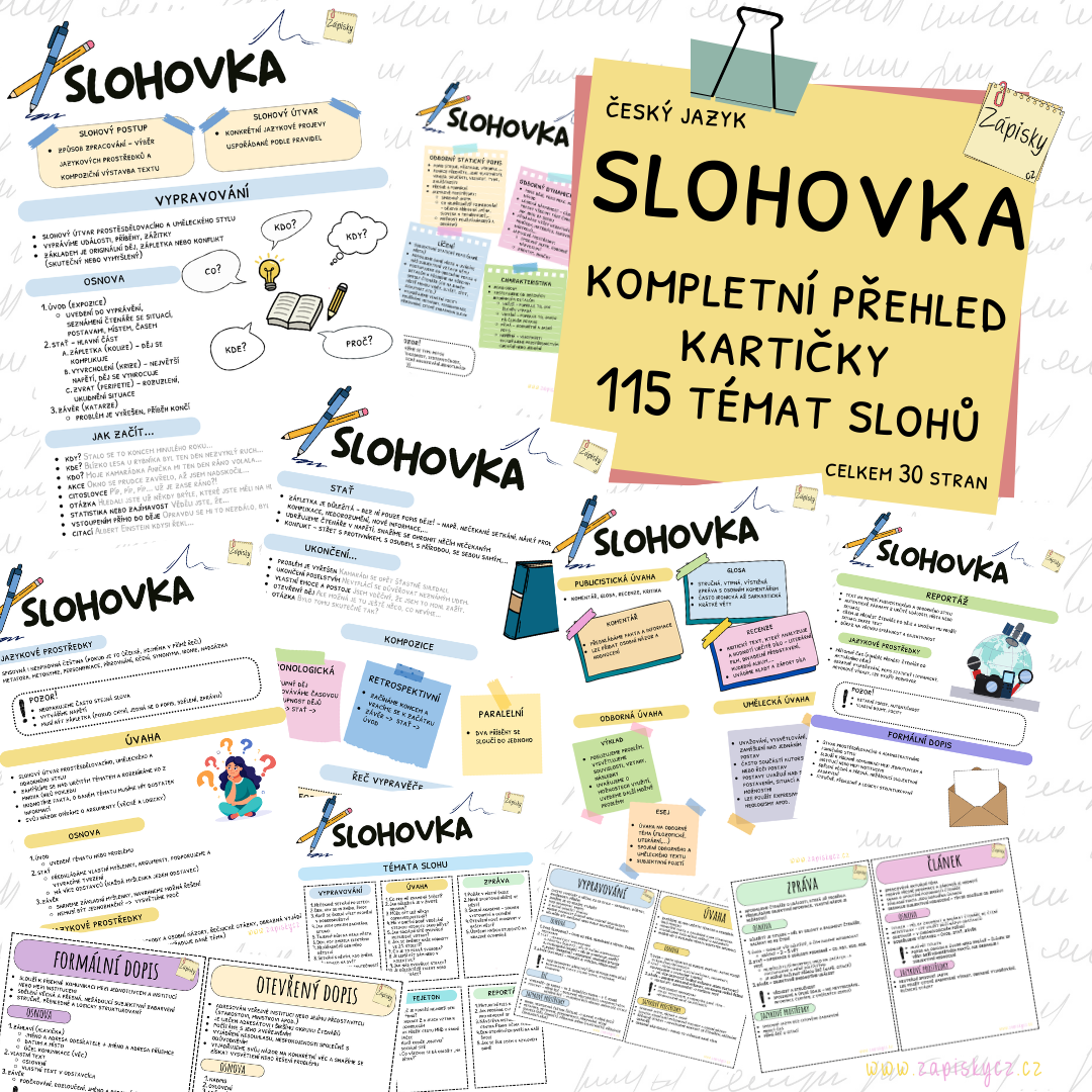 Materiál obsahuje kompletně zpracovaný přehled slohových útvarů, včetně osnov, jazykových prostředků a tipů, na co si dát pozor. Hlavní dokument doplňují kartičky pro snadné opakování a rychlý přehled. Součástí jsou také kartičky s nápady na témata slohových prací.