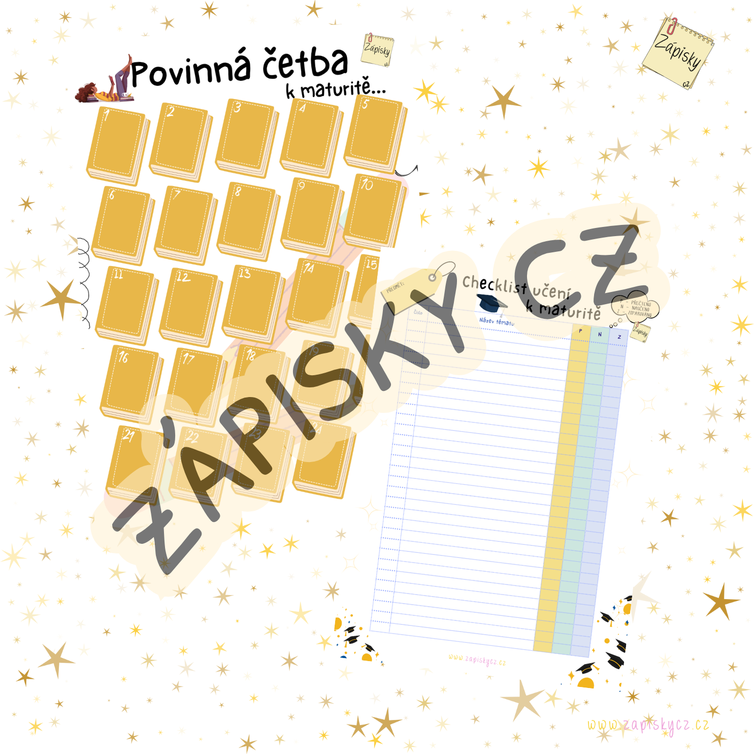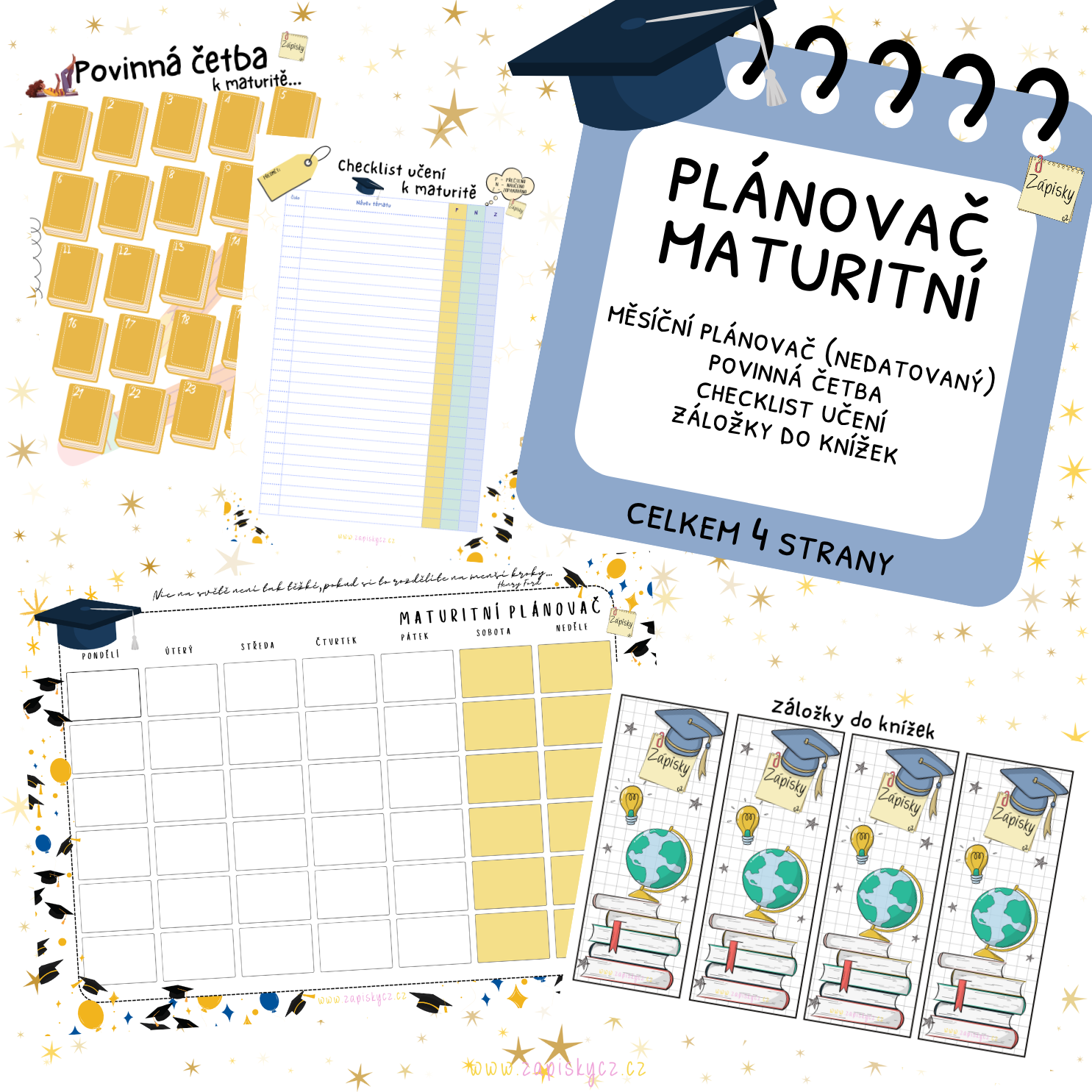 Tento praktický maturitní plánovač pomůže studentům mít přípravu na maturitu pod kontrolou. Najdete v něm měsíční plánovač učení (nedatovaný, takže ho lze začít používat kdykoliv), checklist učiva, checklist povinné četby a také stylové záložky do knih.