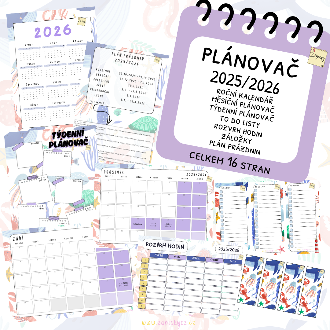 Tento praktický balíček kalendářů a plánovačů obsahuje 16 pečlivě navržených stran, které vám pomohou zorganizovat (nejen) školní rok od září 2025 do června 2026. Využít ho můžete i pro osobní plánování, jako doplněk diáře nebo jako výzdobu do třídy.