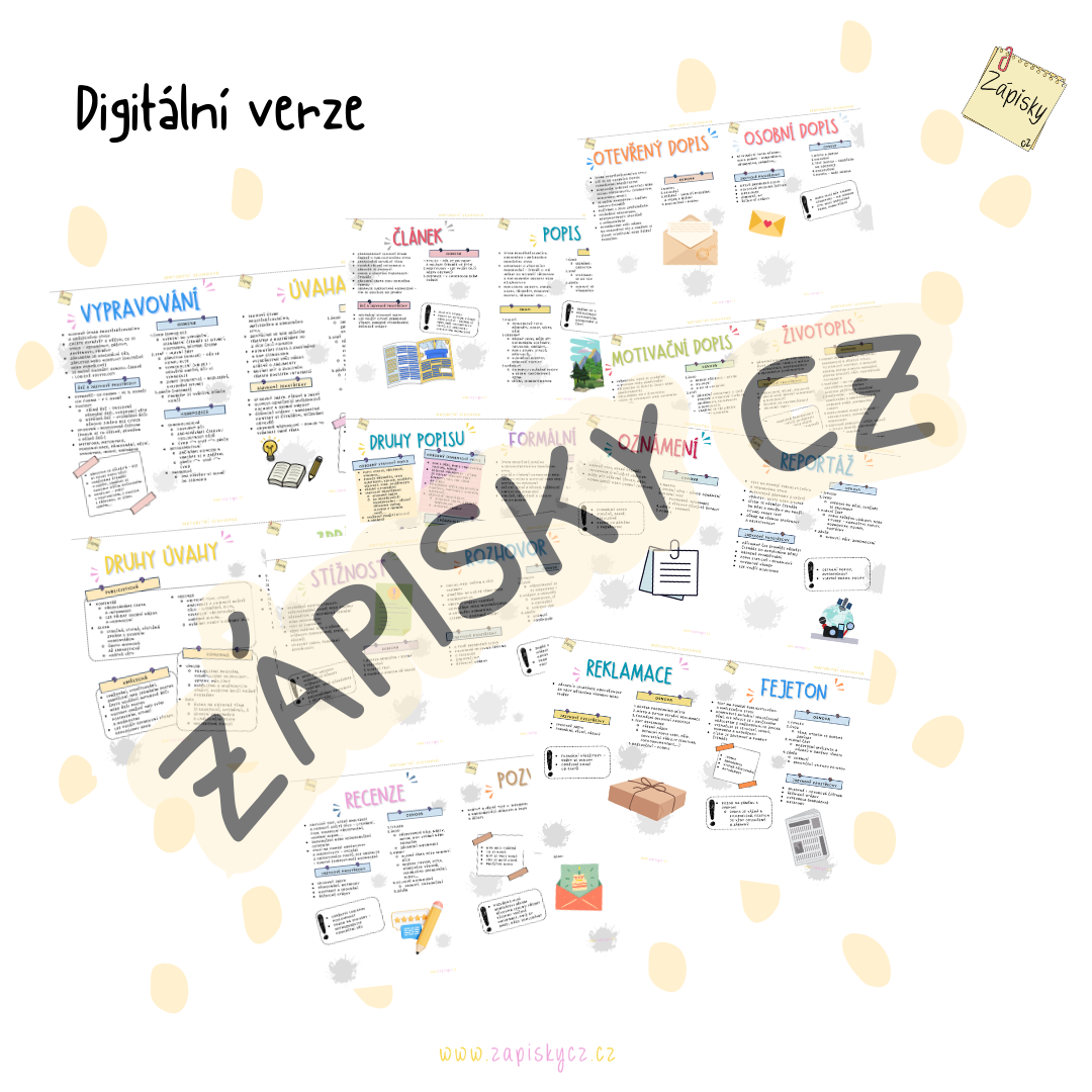 Sada studijních kartiček ke slohovým útvarům, která pomáhá zorientovat se v tom, co psát, jak psát a na co si dát pozor.
