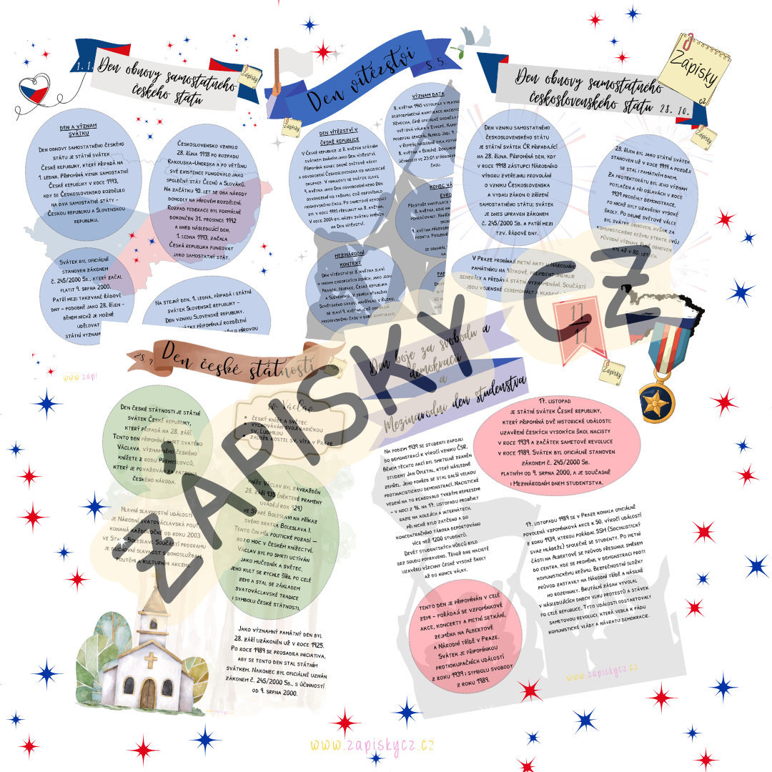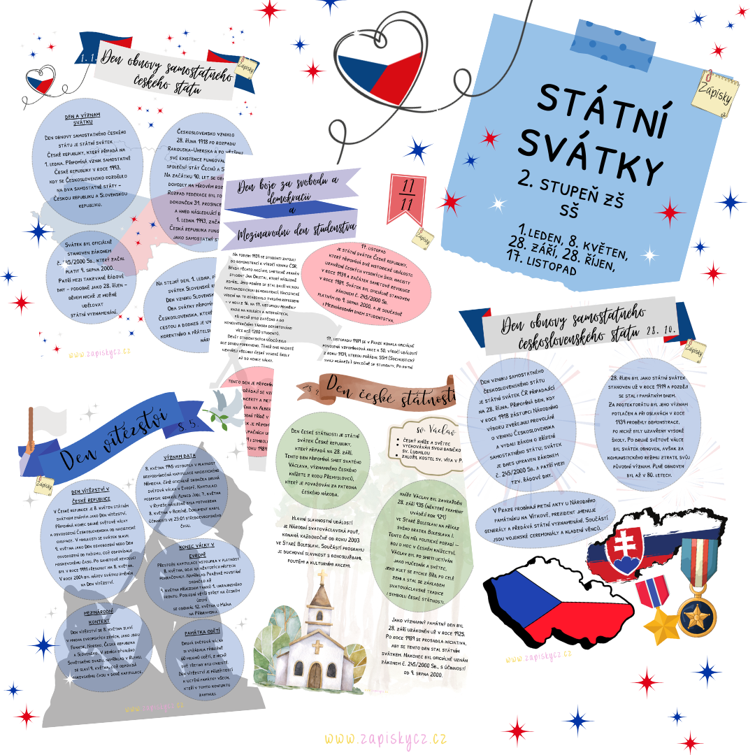 Každý svátek je zpracován na samostatné straně formátu A4 a obsahuje stručné a srozumitelné informace o tom, co se v daný den stalo, jaké má událost historické pozadí a proč je pro naši zemi významná.Materiál je ve formátu PDF, takže jej lze snadno vytisknout, laminovat a opakovaně používat. Je vhodný nejen pro učitele dějepisu a občanské výchovy, ale i pro všechny, kdo chtějí studentům přiblížit nejdůležitější historické milníky.